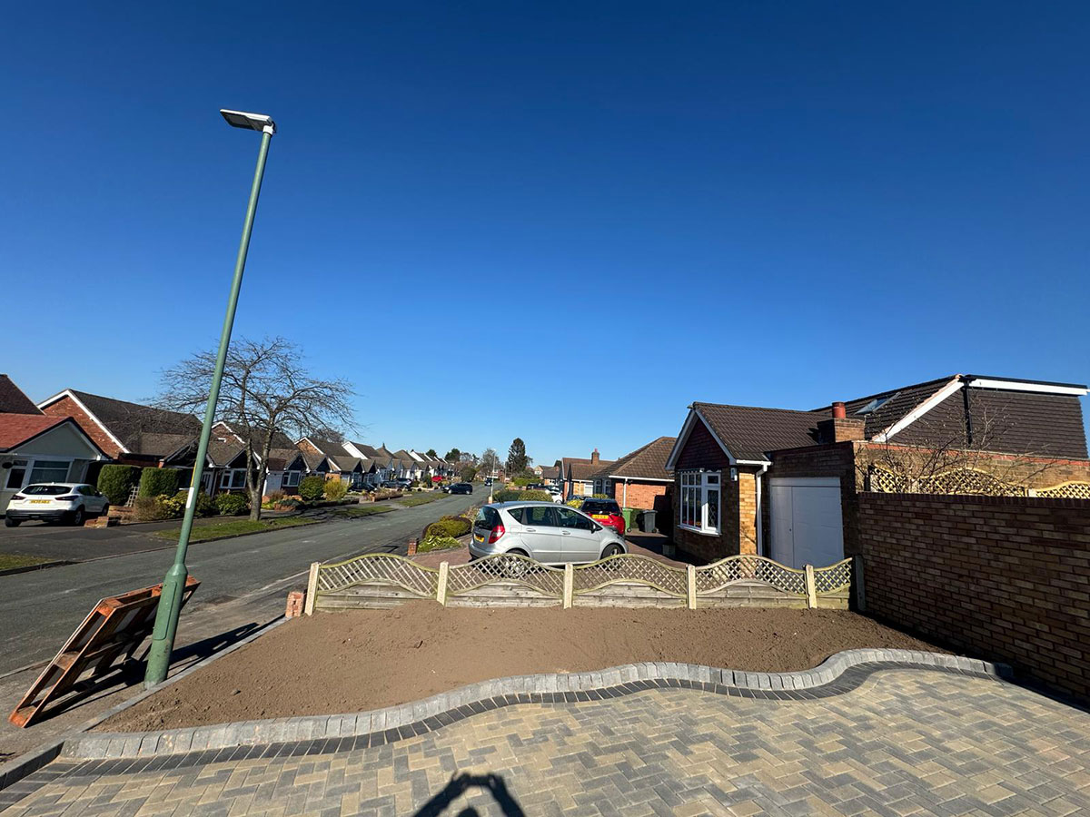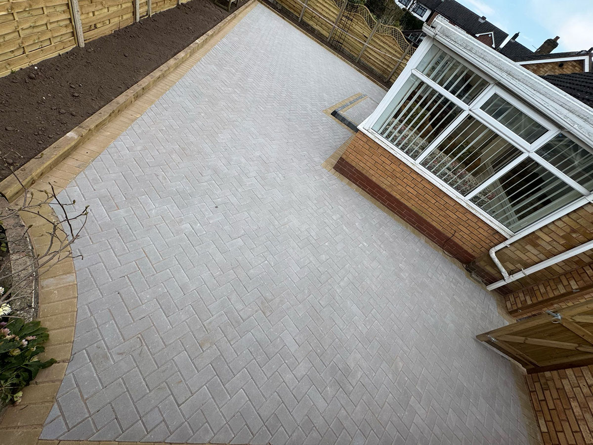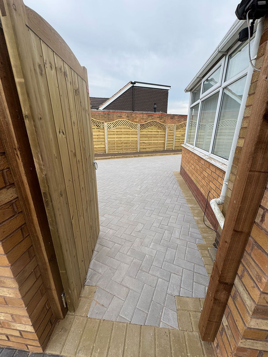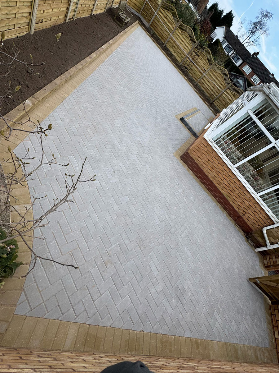 New Block Paving Driveway and Patio, Sutton ColdfieldThe customer wanted to retain some areas for planting both at the front and back of the garden, with generously shaped beds created with contrasting kerb stones which match the driveway border. The garden patio also includes a large step for access to and from the conservatory. A new brick wall has been built to perfectly match the property and includes a new timber garden gate.