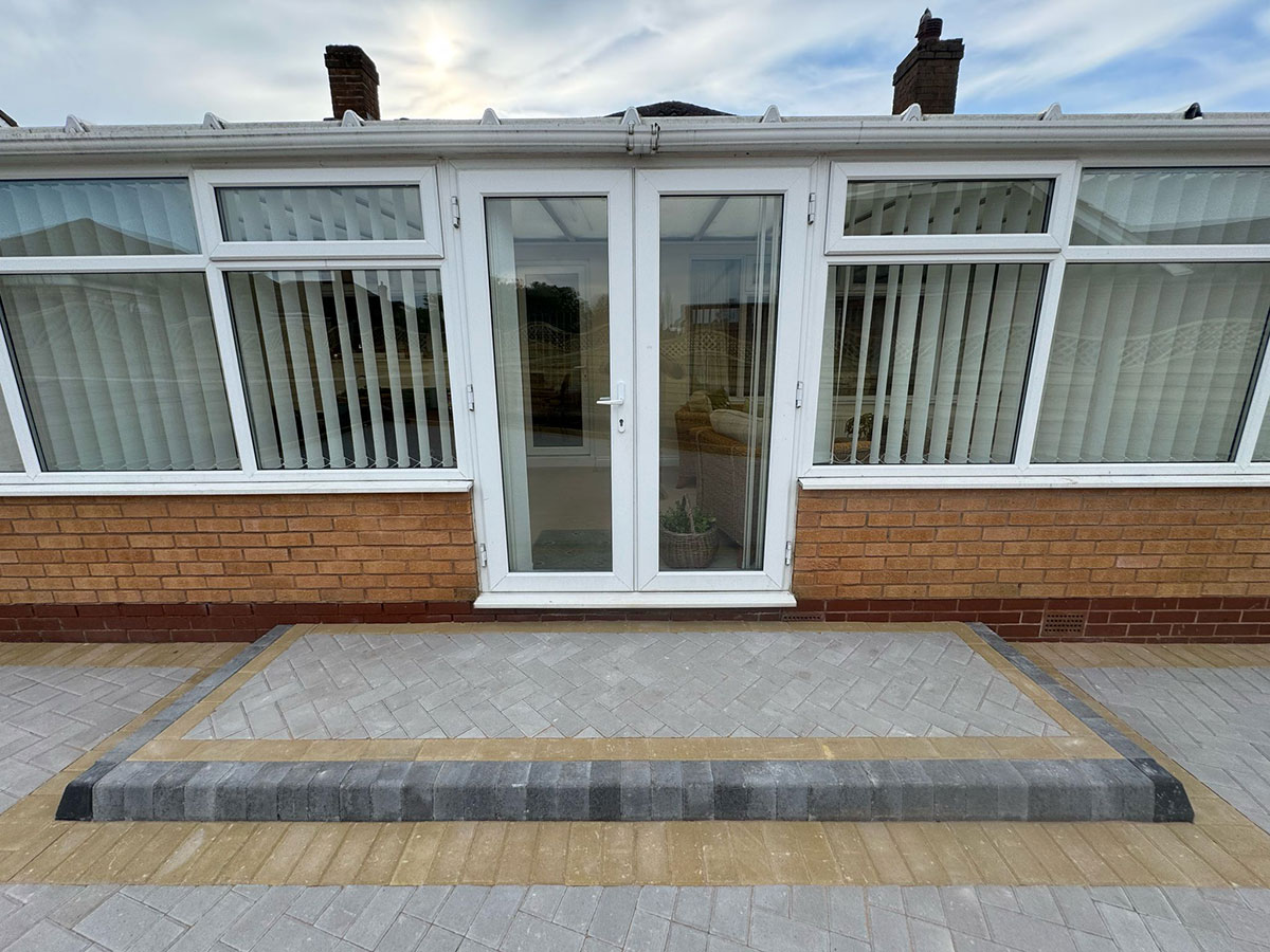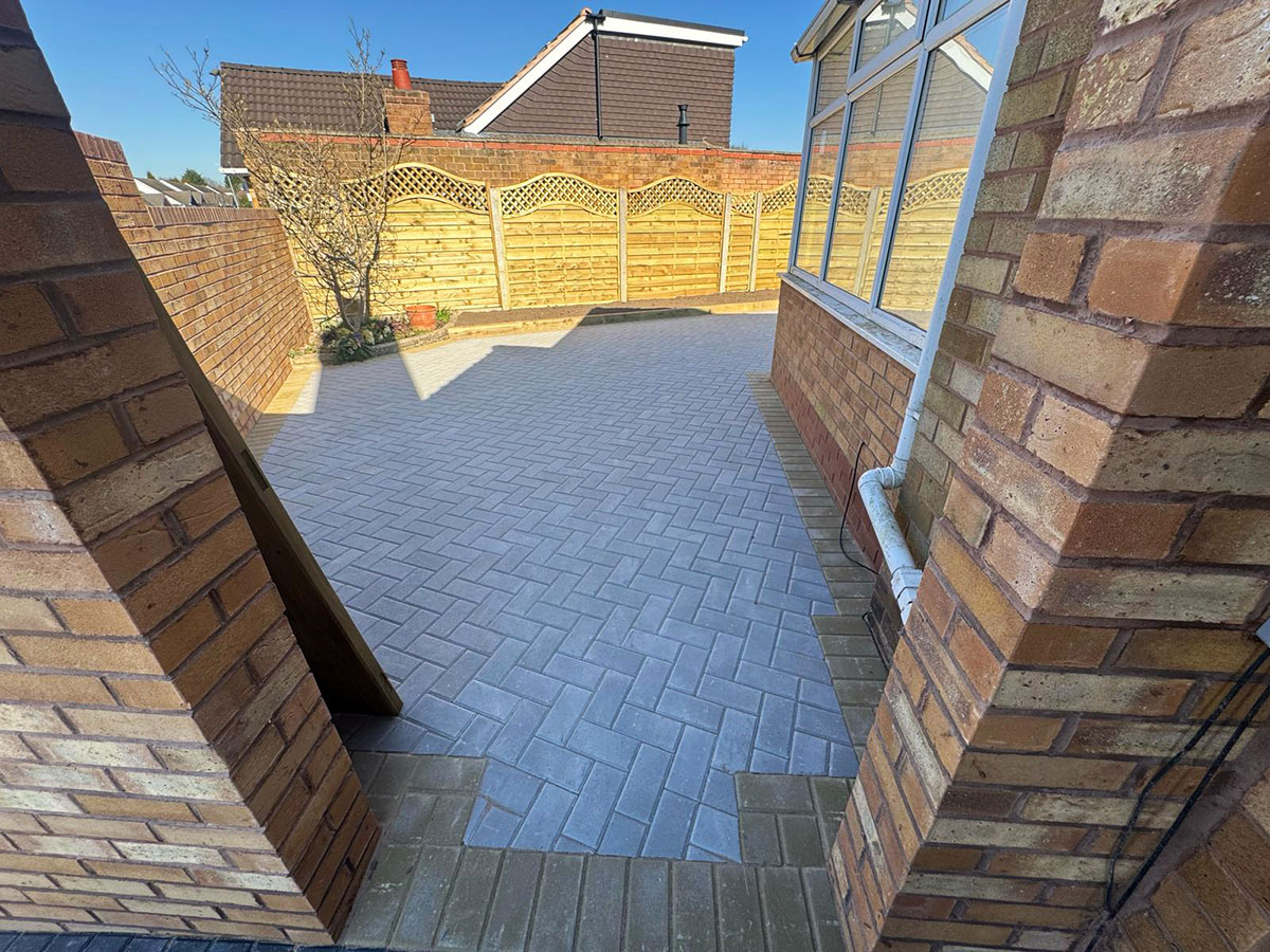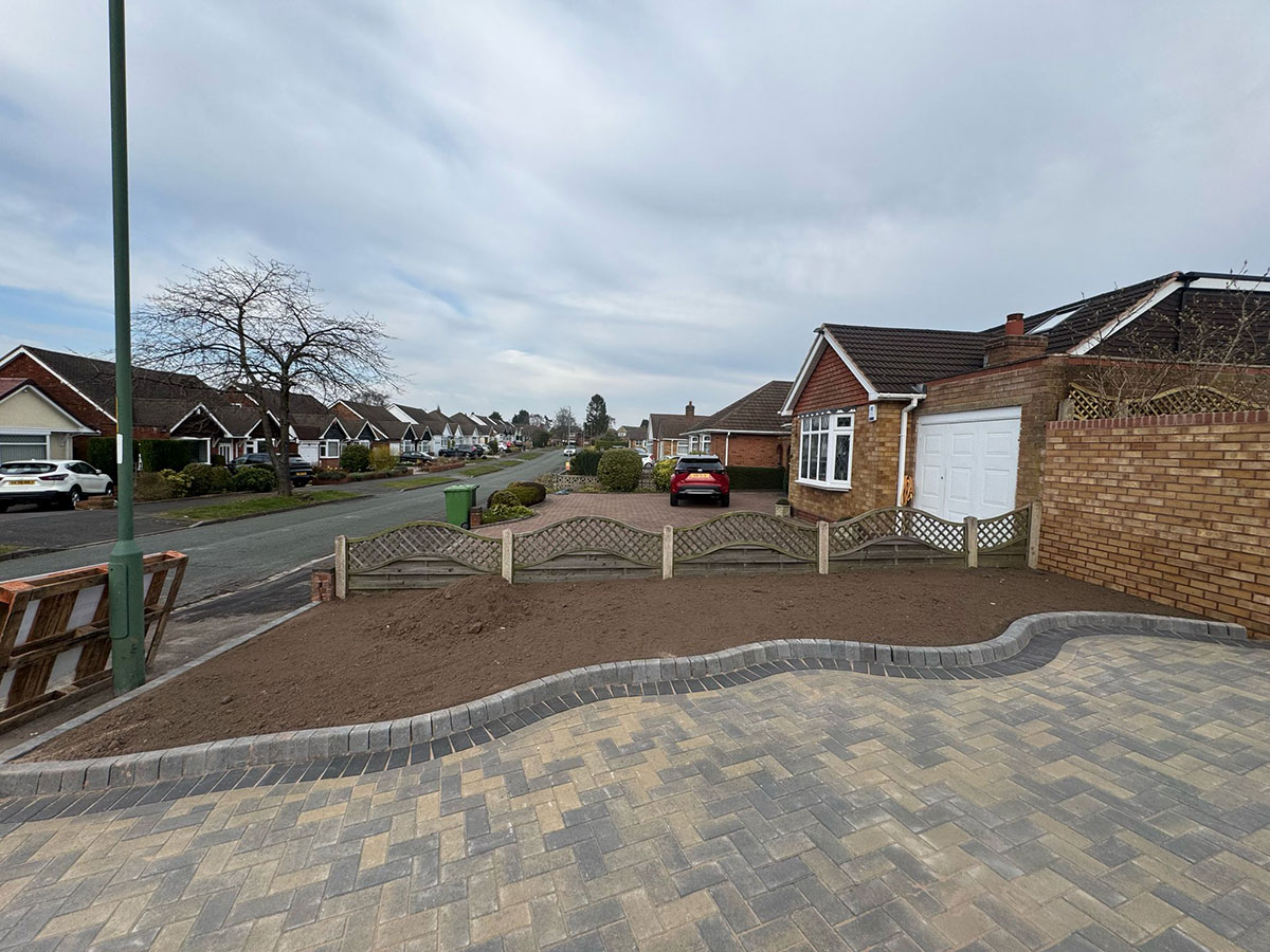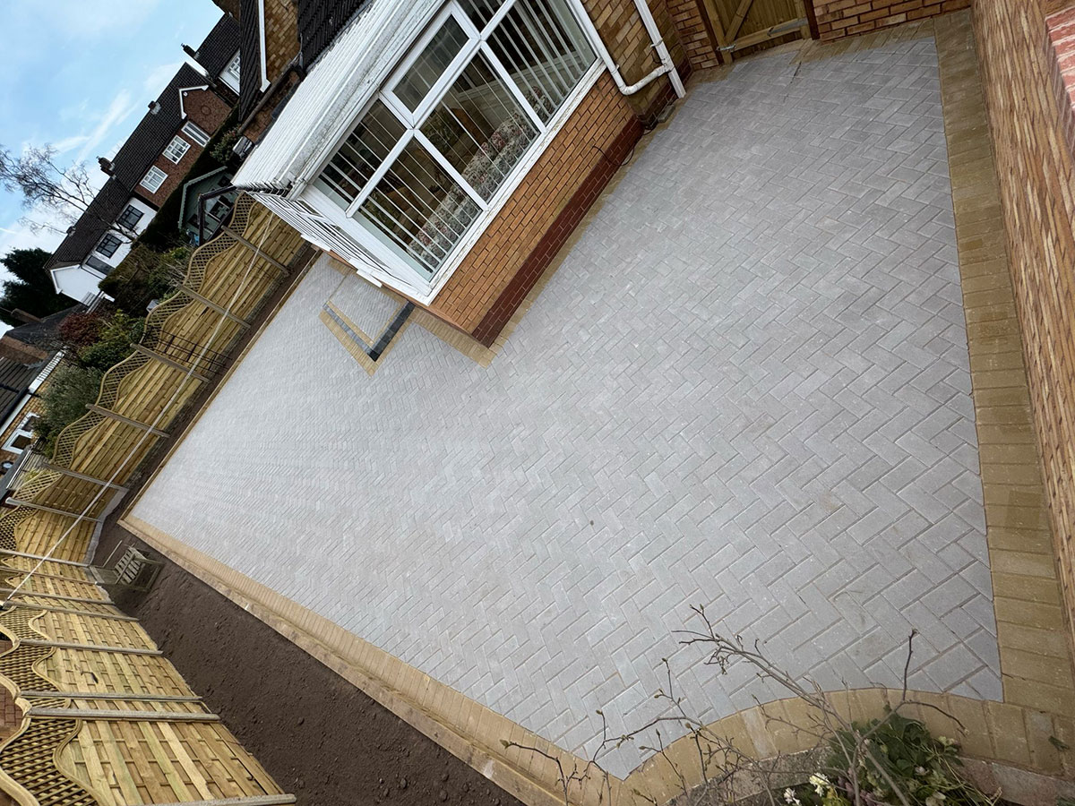 New Block Paving Driveway and Patio, Sutton ColdfieldThe customer wanted to retain some areas for planting both at the front and back of the garden, with generously shaped beds created with contrasting kerb stones which match the driveway border. The garden patio also includes a large step for access to and from the conservatory. A new brick wall has been built to perfectly match the property and includes a new timber garden gate.