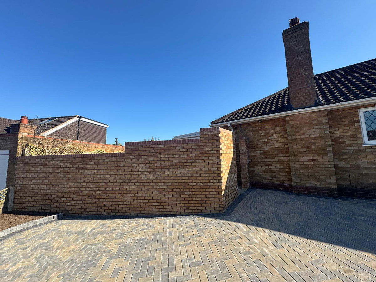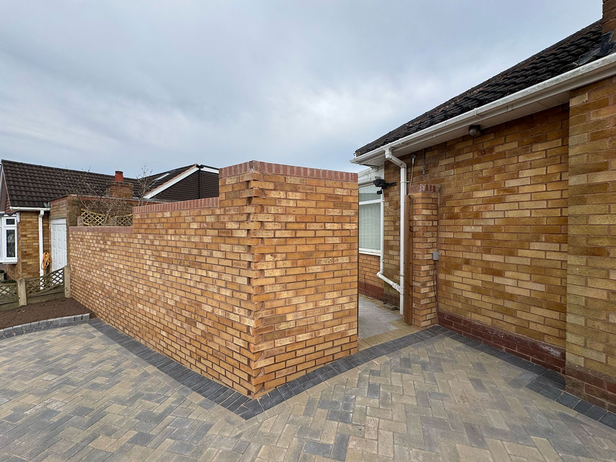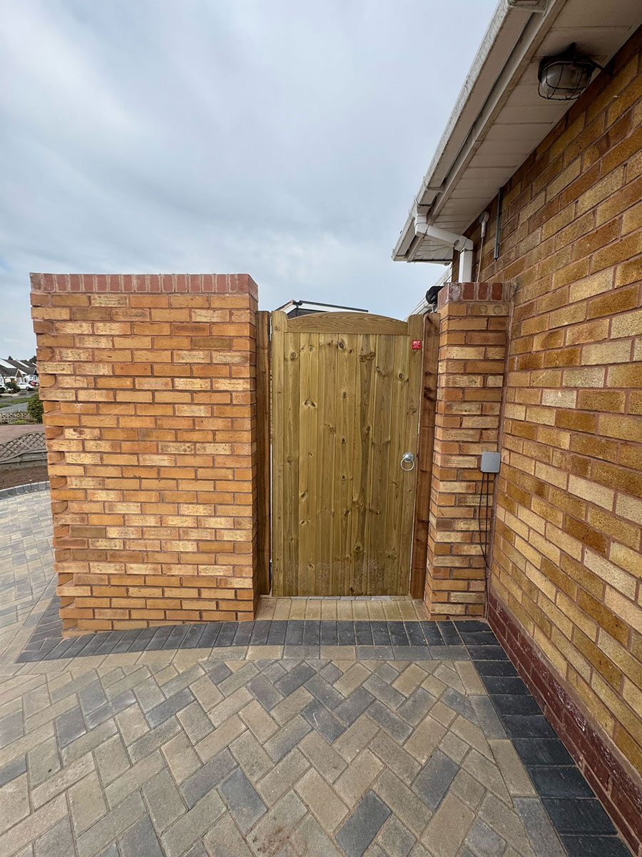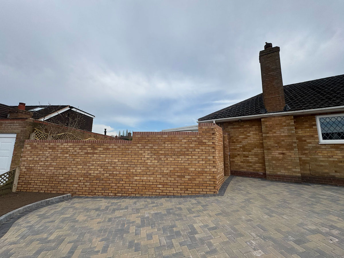 New Block Paving Driveway and Patio, Sutton ColdfieldThe customer wanted to retain some areas for planting both at the front and back of the garden, with generously shaped beds created with contrasting kerb stones which match the driveway border. The garden patio also includes a large step for access to and from the conservatory. A new brick wall has been built to perfectly match the property and includes a new timber garden gate.